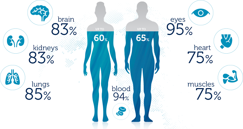 Nước chiếm tỷ lệ 85%, ở da 70%; tim gần 80%. Ngay cả ở xương – nơi rắn chắc trong cơ thể cũng có tỷ lệ nước lên tới 20% và thậm chí là răng cũng có nước chiếm 0,2%.